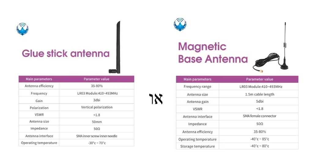 - אנטנת גומי או אנטנת ברזל עם בסיס מגנטי (משתנה במלאי) עם חיבור SMA הגבר 5dBi