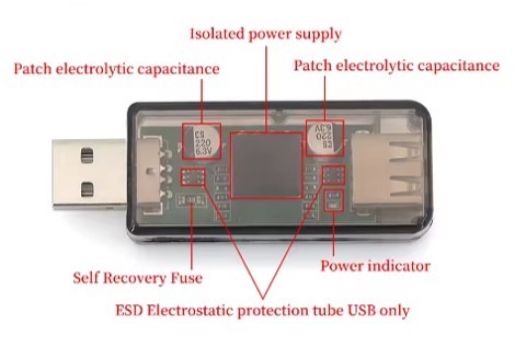 בתוך המתאם יש מבודד גלווני של מתח ונתיך אוטומטי המנתק את הקשר החוזר בין הבקר לפורט ה- USB